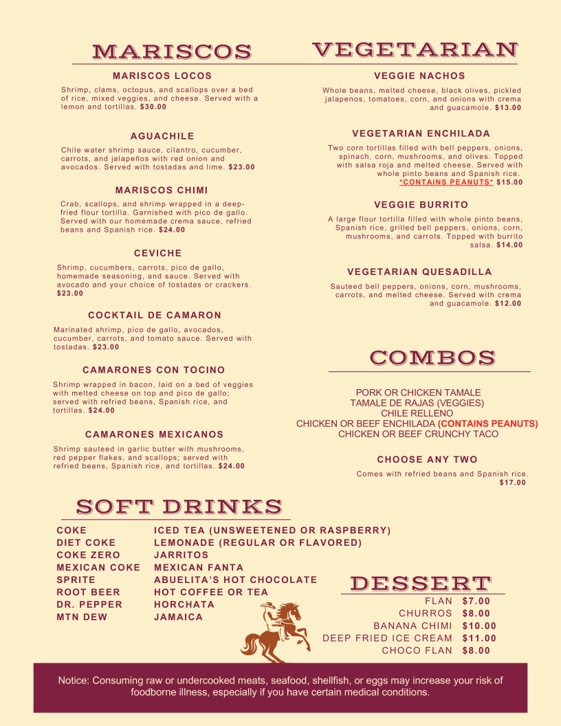 Two corn enchiladas filled with shrimp, tomatoes, and onions, cooked with wine and spices. Topped with salsa verde, and cheese. Served with refried beans and Spanish rice.